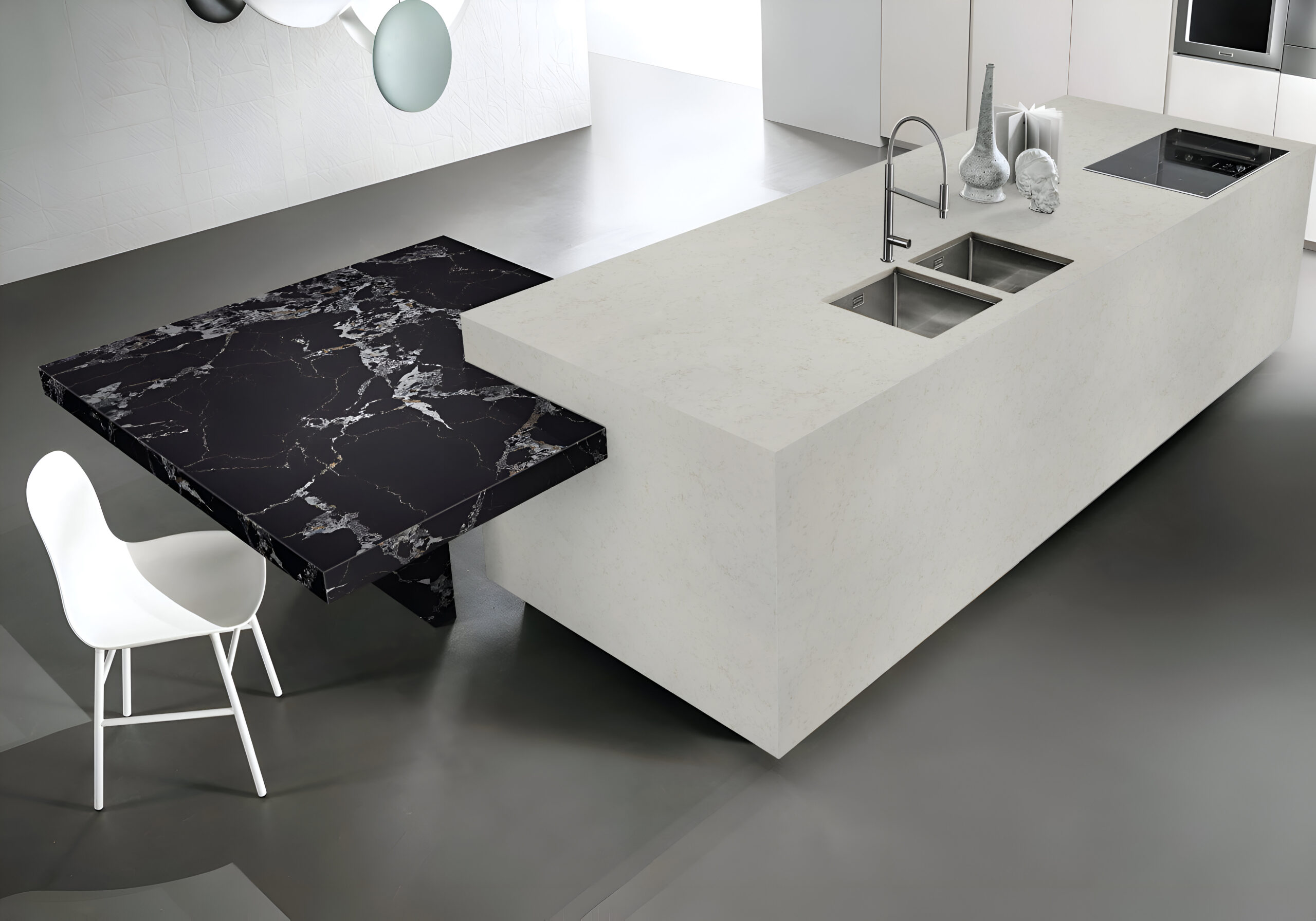 Topaz has a creamy white background with wisps of beige and gold Carrara veining.